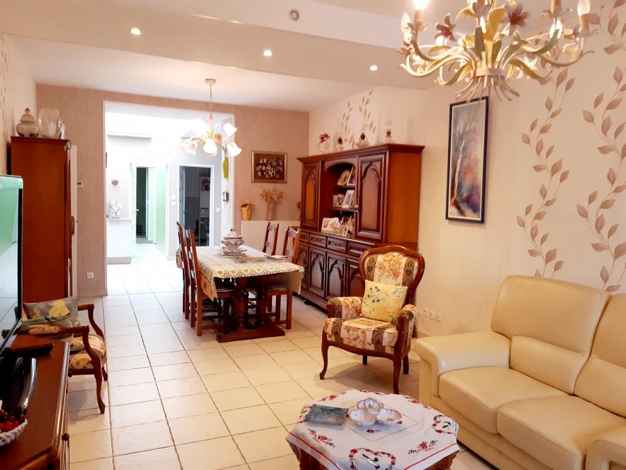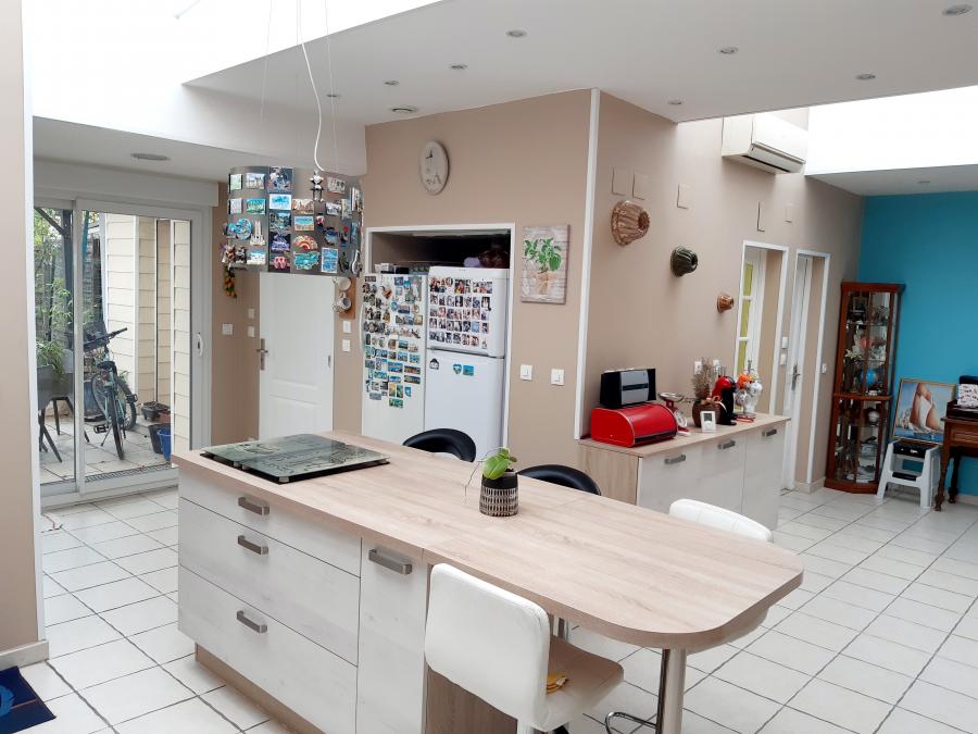 Dans le centre ville, large maison de ville rénovée spacieuse offrant 140m² habitable, très peu d'entretien extérieur avec sa grande terrasse en composite et carrelage de 60m². Salon séjour de 29m², grande cuisine équipée et meublée de 29m² en L avec ilot central et espace repas, cellier de 3,13m² avec chaudière gaz de ville à production d'eau chaude ( 2 ans ), baie vitrée en PVC pour l'accès à la pergola et la terrasse en composite et carrelage, chalet de 11m² sur le fond pour rangement ( PAS DE JARDIN ) , salle de bains récente au RDC de 6,81m² avec meuble vasque, douche italienne, baignoire et meuble colonne, grand WC séparé de 3m² avec lave mains et radiateur. Pièce de 9,6m² pouvant servir de bureau et donnant accès au garage de 17,5m² pour 1 voiture avec porte motorisée et dalle isolée, accès à la cave saine. A l'étage : couloir de 3,2m² desservant 4 chambres 12/11/11/11m² dont une avec dressing et une avec wc sanibroyeur, grenier aménageable de 40m² ( pour 5 ou 6ème chambre ) ou stockage. Nombreux volets électriques, spots, installation électrique refaite, isolation laine de verre avec placo, menuiseries en PVC, Clim réversible ( été hiver ) et Chauffage central au gaz. Beaux volumes, aucun travaux à prévoir. Proximité immediate du centre ville et ses commerces. IDEAL PERSONNE RECHERCHANT DU VOLUME AVEC PEU D ENTRETIEN EXTERIEUR. Dpe : C(128). Ges : C(27).