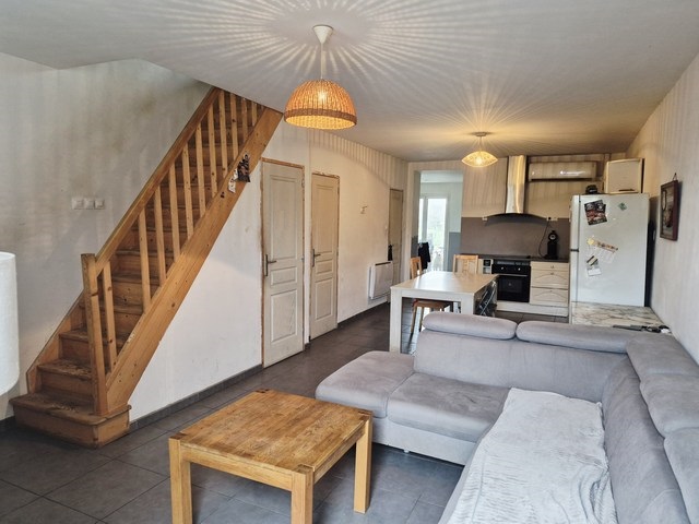 Maison de ville mitoyenne rénovée dans le centre de Verquin. Salon séjour carrelée ouvert sur une cuisine équipée et meublée ( plaque induction...