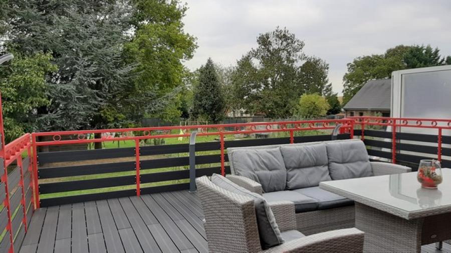 Garage attenant et large passage sur le côté pour caravane ou autre véhicule, stationnement possible sous la terrasse suspendue, beau jardin clos.
