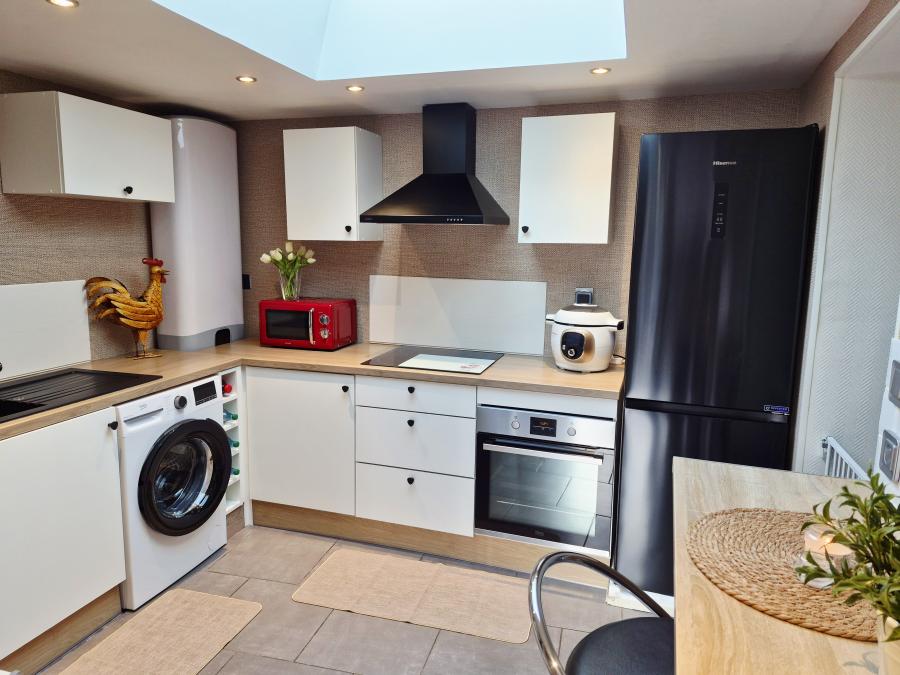 Au rez-de-chaussée vous retrouverez une entrée, salon séjour carrelé de 37m² avec poêle à granulés "Palazzetti" programmable sur smartphone ou manuellement, poutres apparentes et colonnes en briques dans le séjour, une cuisine équipée neuve semi ouverte de 9m² ( four, plaque induction, lave vaisselle, hotte ) avec puit de lumière ( grand vélux ). La toiture de la cuisine avec isolation et vélux rénovée en 2026 ( sous garantie décennale ), une salle de bains de 3.15m² équipée d'un meuble vasque, d'une colonne de rangement, d'un radiateur sèche serviettes de marque"Thermor" programmable et économique, d'une baignoire et d'un wc suspendu.