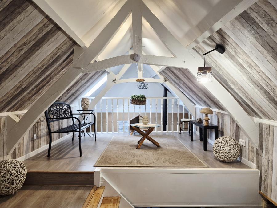A l'étage : un joili escalier dessert une belle mezzanine surplombant le séjour pouvant servir de bureau ou de coin détente, d'une 2nde chambre de 20m² avec poutres apparentes , rangements sous mansarde.
